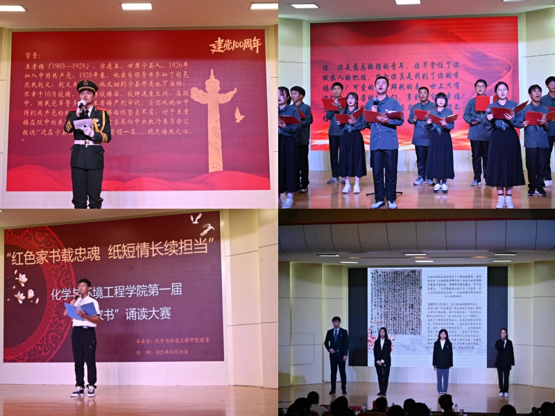 为进一步推升做实在青年老员工中开展党史学习教育,引领团员青年传承革命精神,坚定理想信念,坚定奋斗意志,10月20日下午,英国上市官网365以“诵红色家书 传革命基因”为主题的第一届红色家书诵读大赛决赛在学术报告厅举行。化学与环境工程公司党委书记水心宝、党委副书记胡承功以及公司团委书记、辅导员及员工代表近300人观看了比赛。