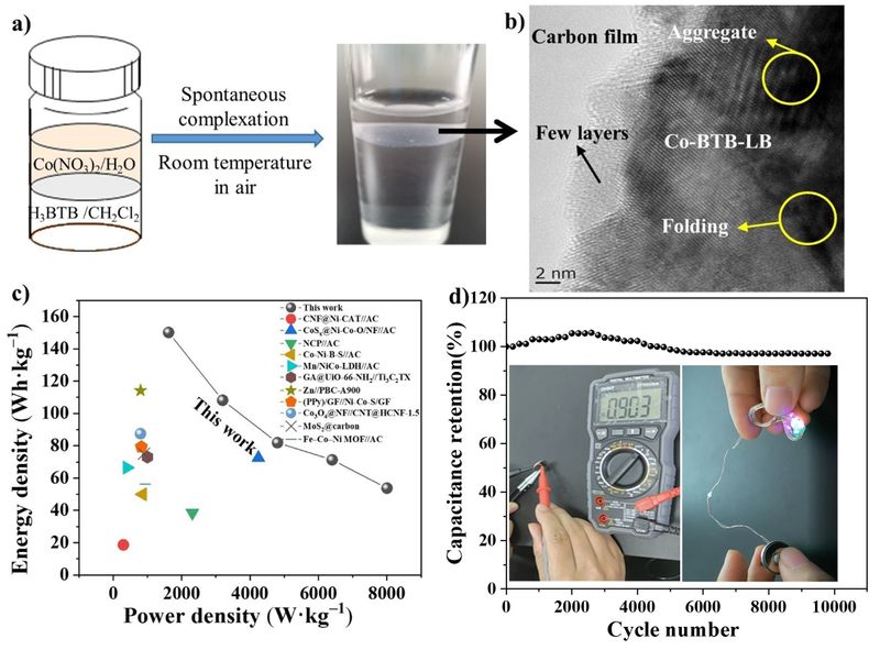 2 (a) 二维MOF纳米片Co-BTB-LB的合成方法示意图;(b) 二维MOF纳米片Co-BTB-LBHRTEM图;(c) 本工作与其他有报道的非对称超级电容器材料的能量密度和功率密度比较图;(d) 非对称超级电容器在电流密度为10 A·g−1时的循环稳定性测试。插图:非对称超级电容器设备点亮发光二极管的示意图。