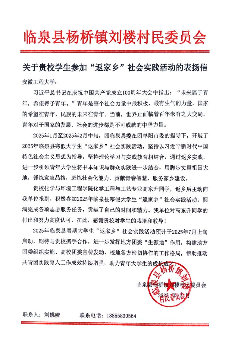 2月17日,公司英国上市官网365化工242班学子高东升在寒假期间积极参与返家乡社会实践活动,凭借出色的表现和无私奉献的精神,获得了当地相关单位的高度认可,并收到了表扬信。